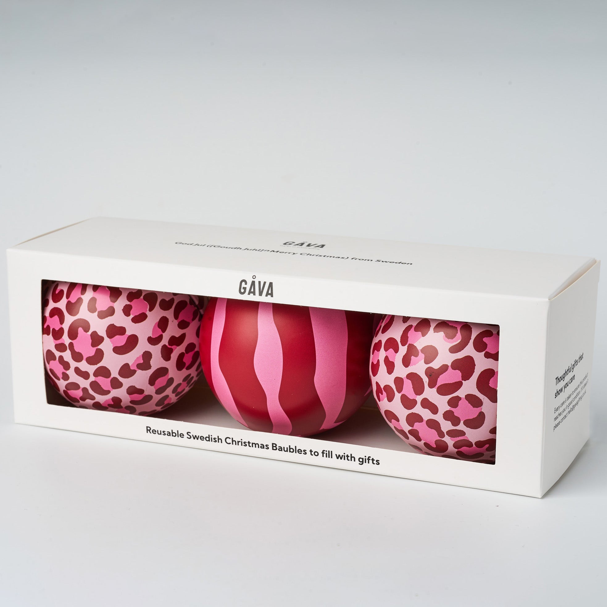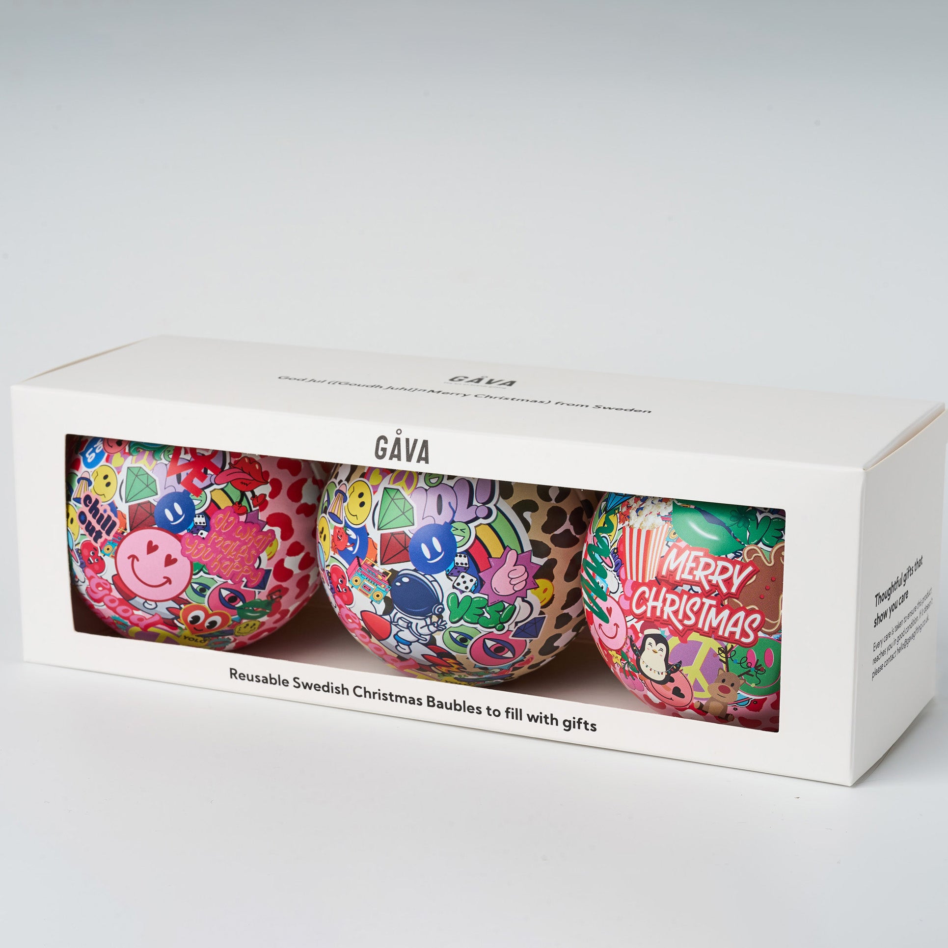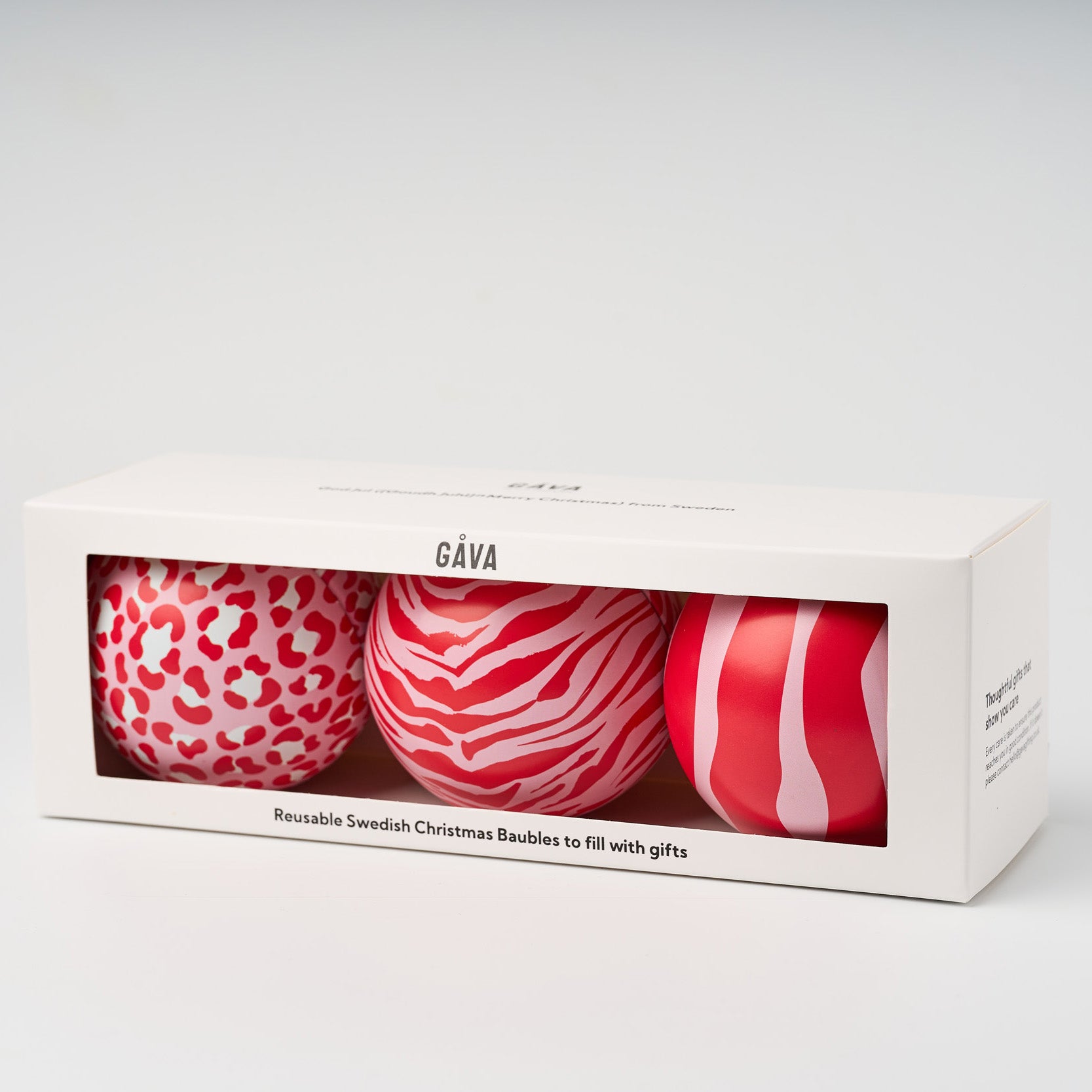 Christmas Baubles by Gåva are reusable baubles in Swedish design filled with delicious chocolate truffles. Measuring 8cm each and made out of durable tin, these unique gifts are designed for you to re-fill year after year, making Christmas more eco-friendly. Choose from a set of one, two or three - all presented in Gåva gift boxes.